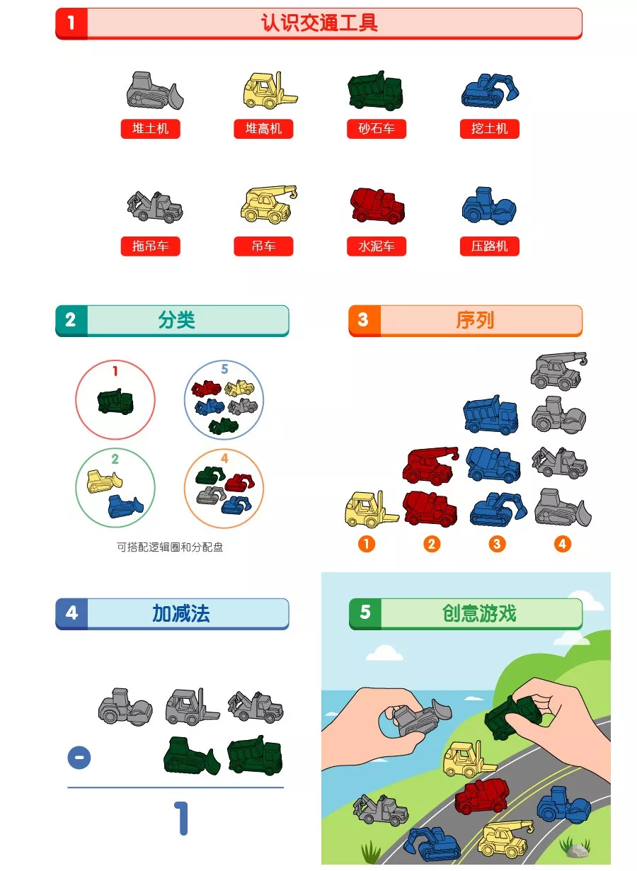 ✔ 孩子可以培养触觉和认知能力,观察不同工程车组的形状和特徵,并通过抓取的动作来训练手眼协调。