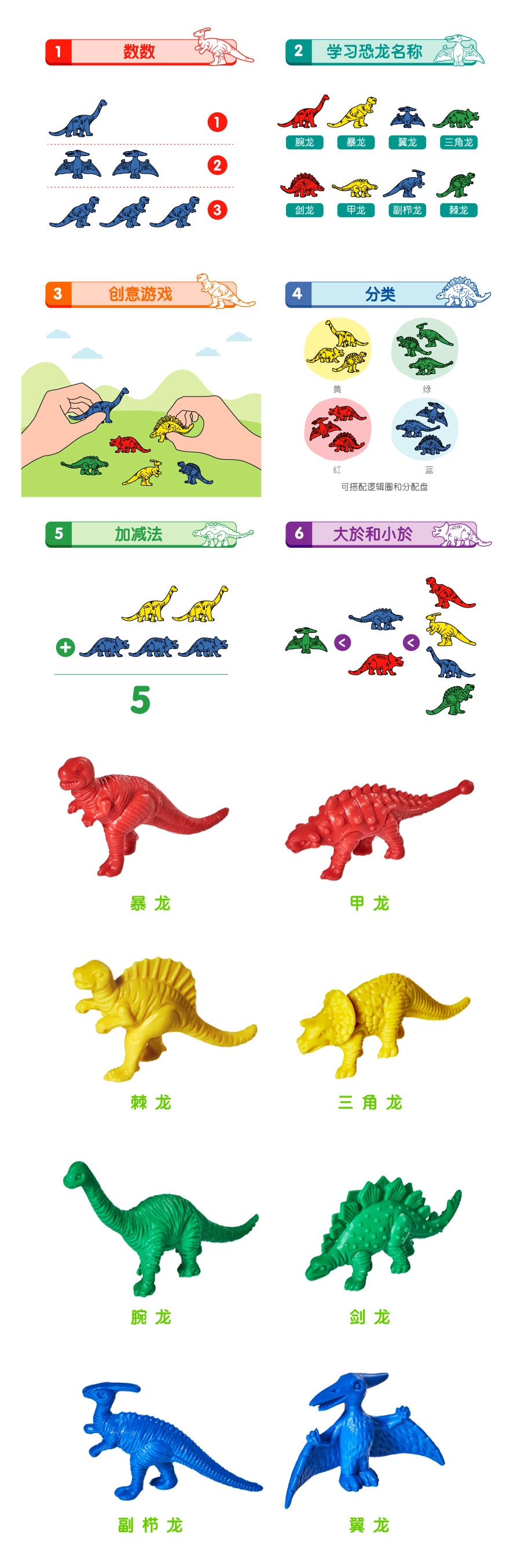 ✔ 孩子可以培养触觉和认知能力,观察恐龙身上的特征和纹路,并通过抓取的动作来训练手眼协调。