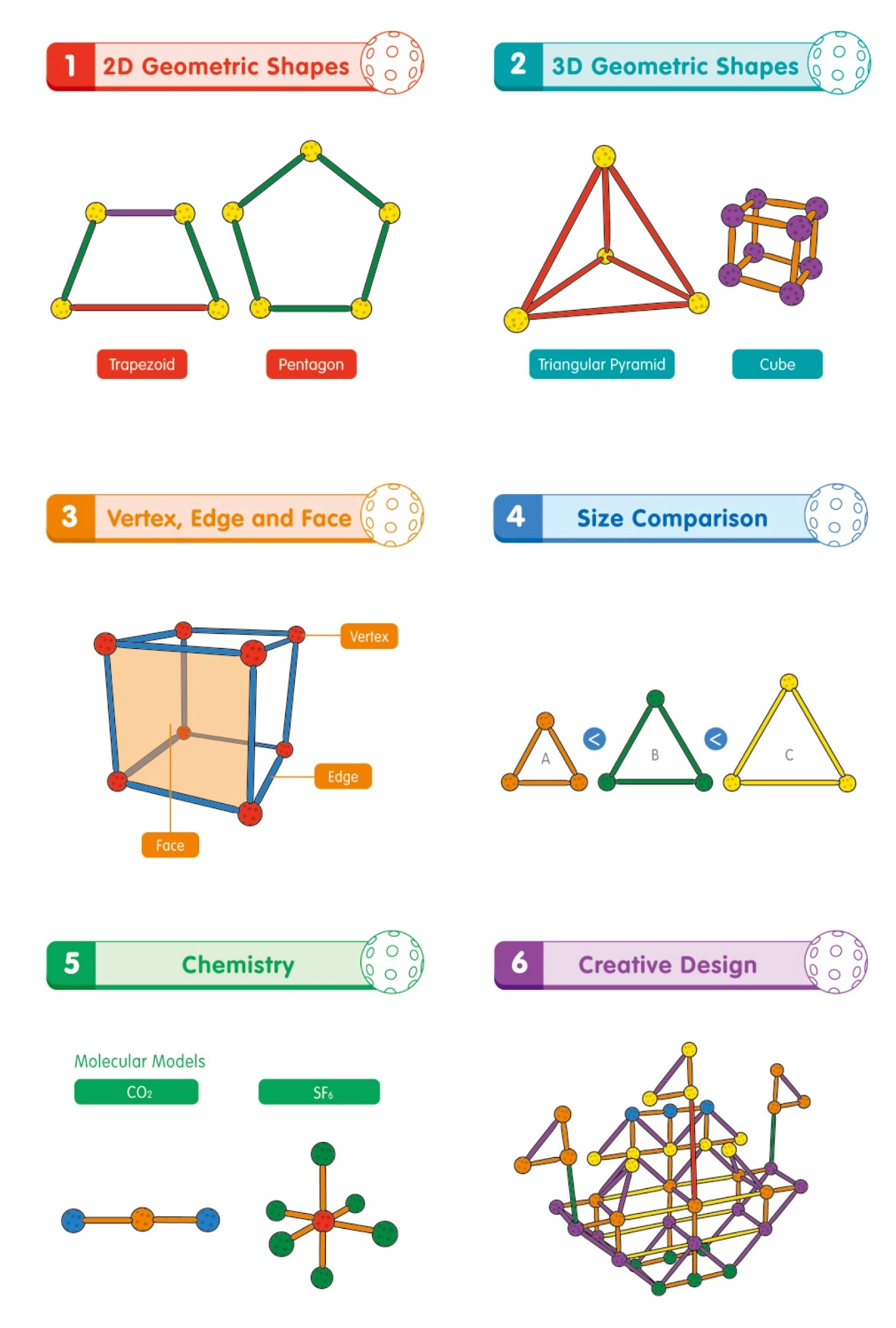 Geometric Construction Set is a perfect learning tool for geometry, matching, creativity, chemistry and art. The balls are all the same size with 26 connecting holes each; the sticks come in groups of varying lengths. Through the building 2D and 3D models, the child learns the concepts of colors, counting, sorting, length, space, shape and structure. By connecting the sticks with the balls, children can also develop hand-eye coordination, fine motor-skills, observational skills and logical thinking.